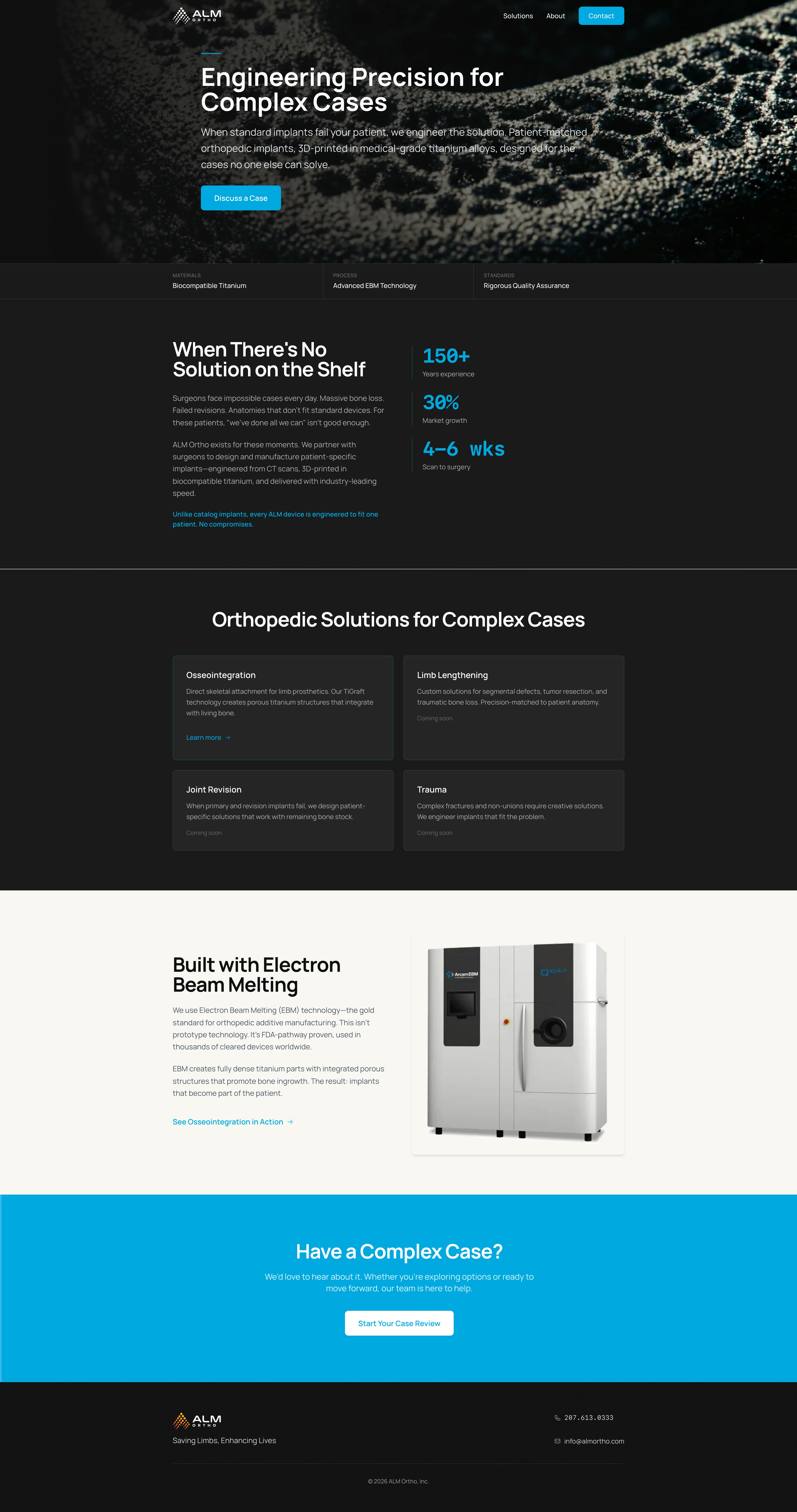 ALM Ortho makes 3D-printed titanium implants — spinal cages, knee components, that kind of thing. Their audience is surgeons and hospital buyers, and the old site was basically a spec sheet. They needed something that actually explained the tech without reading like a whitepaper.